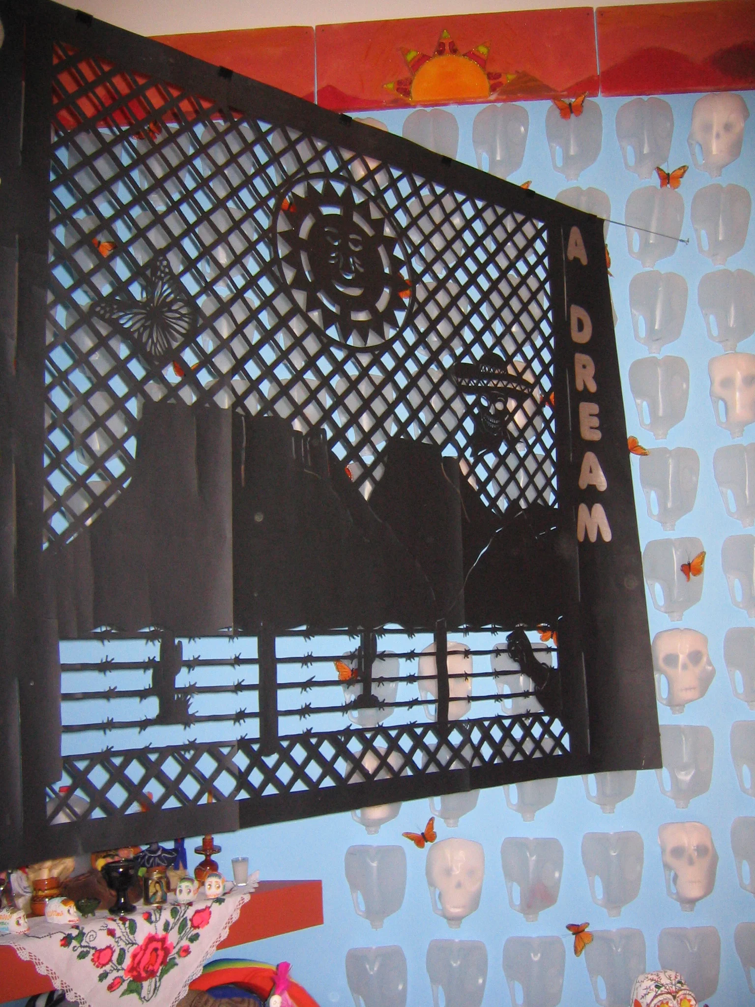 We honor and bless the present day traveler with our altar. The Monarch Butterfly freely migrates through Canada, Mexico and the United States. Also, the Monarch Butterfly was thought to be the Aztec warriors spirit returning home. For these two reasons we include the Monarch Butterfly. This altar is for all the unknown souls that die in the desert. We pray that their sons return home.